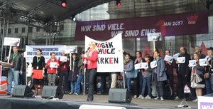 Für die Forderungen des Landesmusikrates demonstrierte am 1. Mai ein breites Bündnis aus MusikschulleiterInnen, MusikschullehrerInnen, ver.di-Mitgliedern PolitikerInnen und VertreterInnen der Bezirke. Für die Sache der MusikschullehrerInnen auf der Bühne sprach Bezirksstadträtin Juliane Witt.
